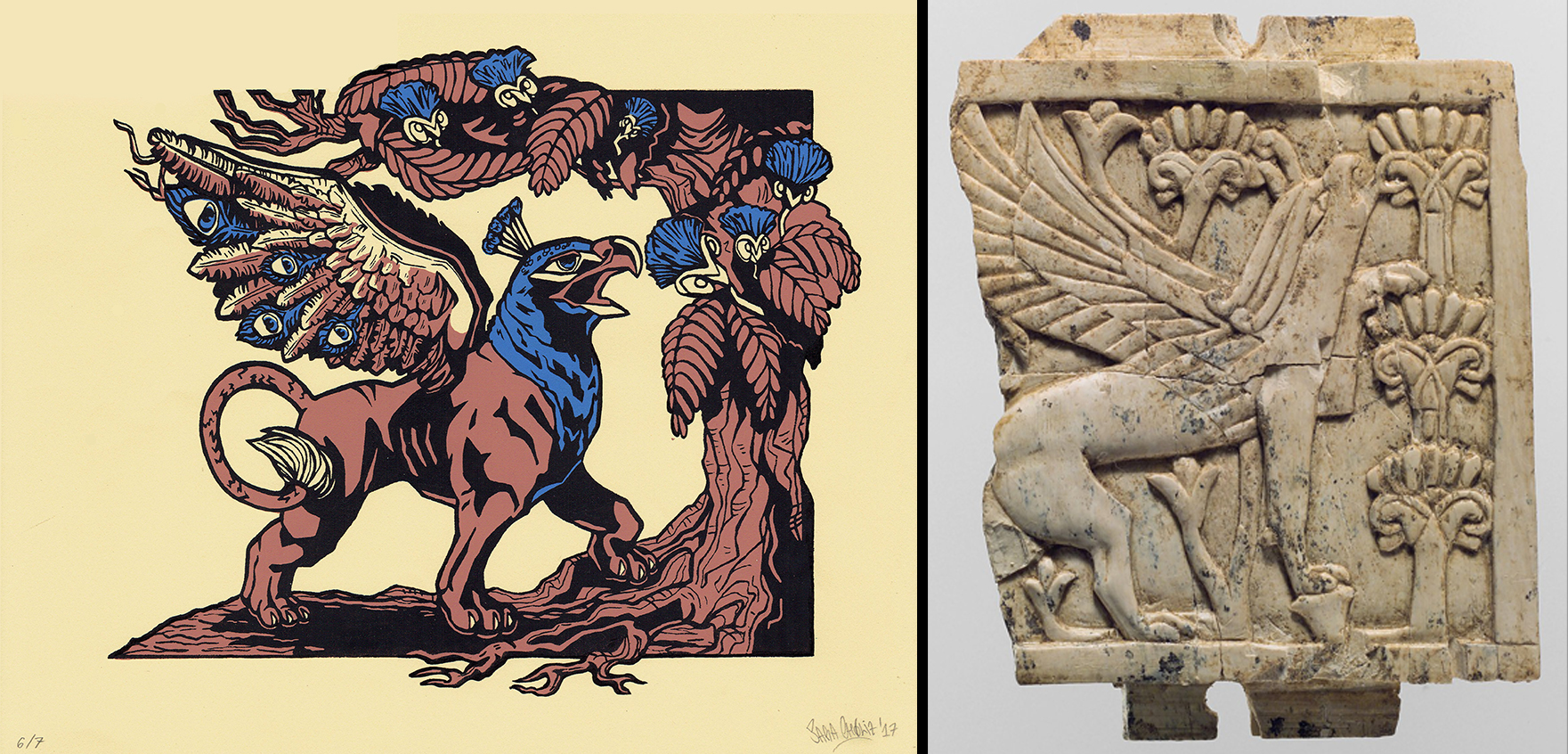 Relieve asirio de marfil: Grifo comiéndose una flor del árbol de la seda