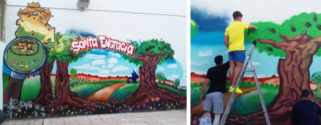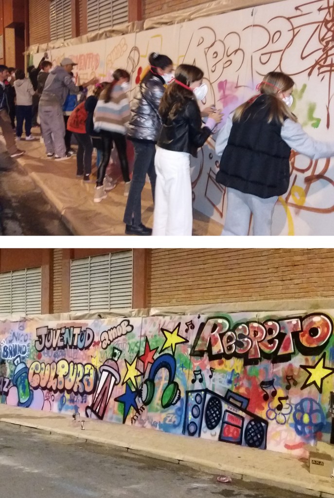 Nuestra meta final era la intervención y mejora del espacio público a través de la pintura mural, como un medio de expresión social con el consiguiente efecto dinamizador y de empoderamiento de su población, siendo los y las jóvenes del mismo centro de día los principales artistas protagonistas.